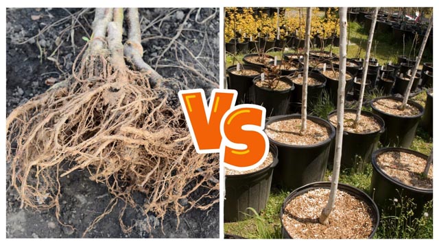 It is much easier to move around bare root trees, as you are not hauling heavy soil and large plants, but planting bare root trees appropriately requires some experience and has a shorter planting window. Overall, it is usually easier to sacrifice the short-term grunt work on planting day than hitting the sweet spot of planting time required by a bare root tree and pruning and shaping it appropriately as it grows.